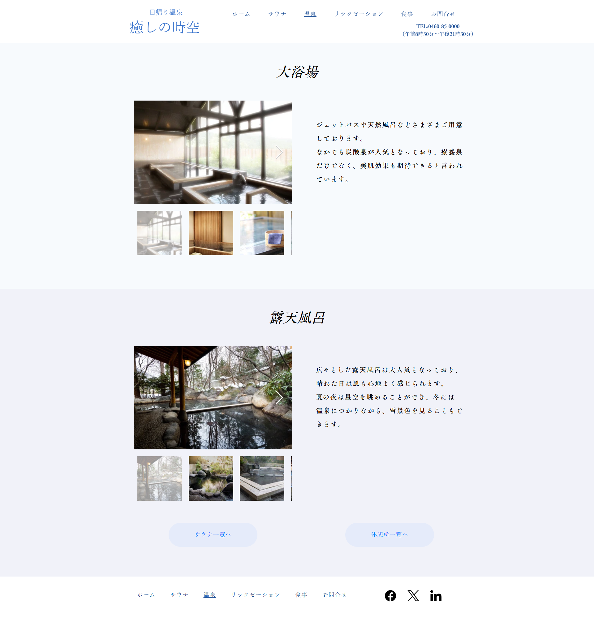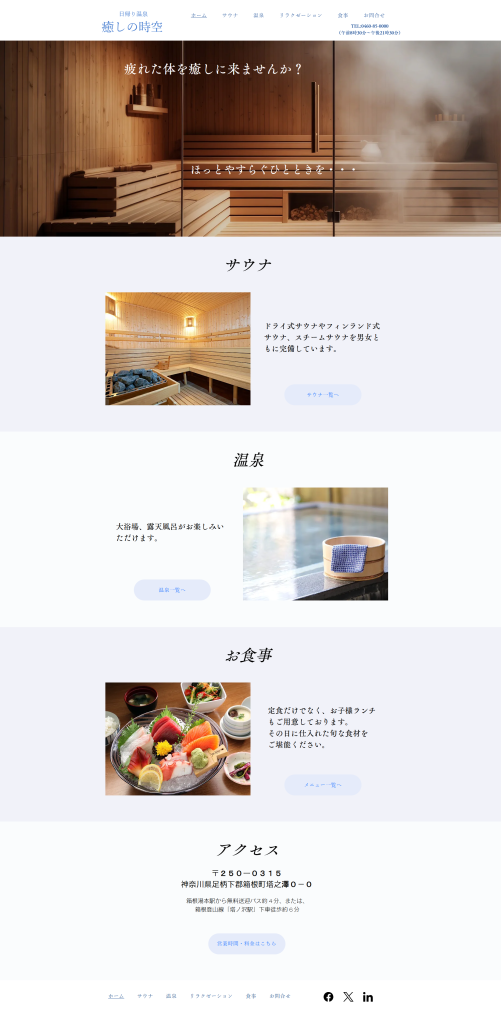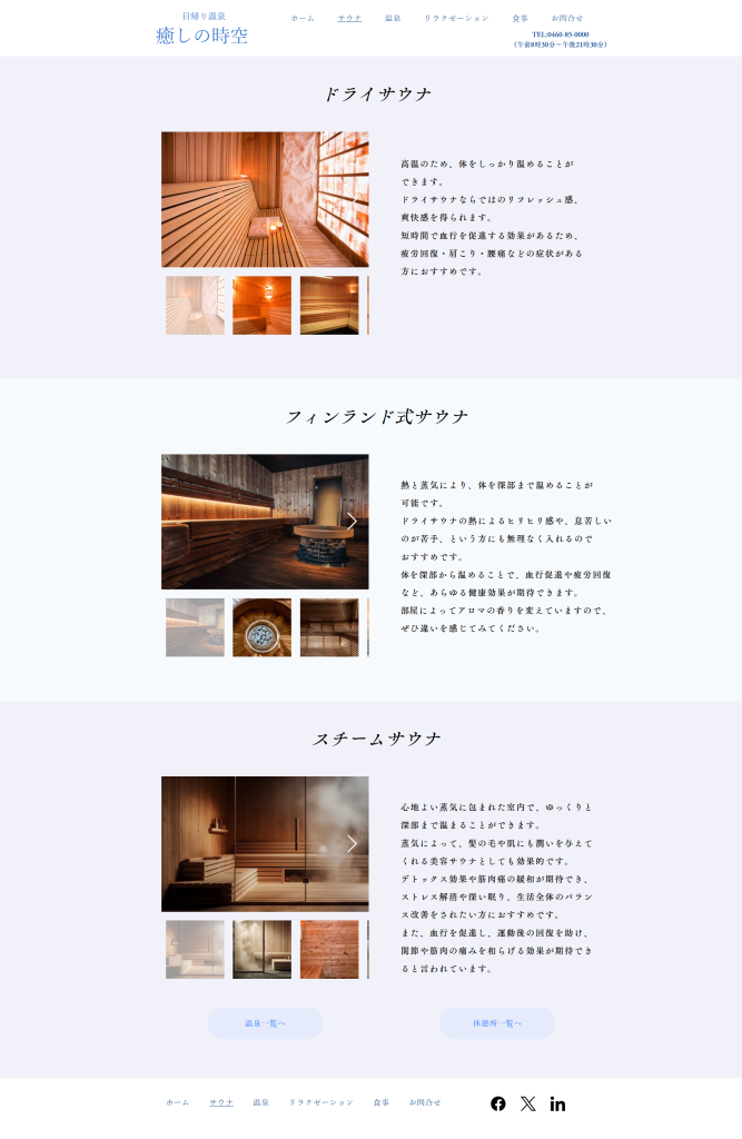 サウナや温泉だけでなく、個室や食事の情報も載せることで、幅広い世代の方々に行ってみたい思えるホームページを意識して作成しました。